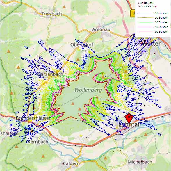 Erläuterung: Bei klarem Himmel wird durch die Rotoren von WKA ein bewegter Schattenwurf erzeugt, der zu optischen Immissionen führt und auch eine erhebliche Belästigung mit sich bringen kann. Die immissionsschutzrechtlichen Grenzen für Schattenwurf dürfen nach gegenwärtigem Stand 30 Stunden pro Jahr und 30 Minuten pro Tag nicht überschreiten. Nach den Planungen von 2013 wurden diese Grenzen in den bewohnten Gebieten rund um den Wollenberg nicht erreicht. Dennoch wären weite Gebiete der Kernstadt von Wetter sowie in den Ortsteilen Oberndorf und Warzenbach, aber auch in Sterzhausen, Brungershausen und Kernbach sowie Dautphetal-Elmshausen von Schattenwurf in Höhe von 10 Stunden pro Jahr (teilweise auch mehr) betroffen gewesen, ohne dass die Anwohner darüber im Vorfeld informiert wurden.