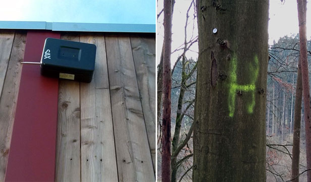 Bild: Links: Fledermausdetektor an einer Leiteinrichtung im Juni 2019. Rechts: Markierter Habitatbaum der Kolonie „Teichtannen“ im Februar 2020. Quelle: bi-wollenberg.de/, CC BY-SA 3.0